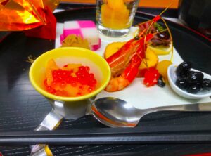(伊達巻・市松蒲鉾・数の子・黒豆・養老海老・いくらのおろし和え・ローストビーフ・栗きんとん)